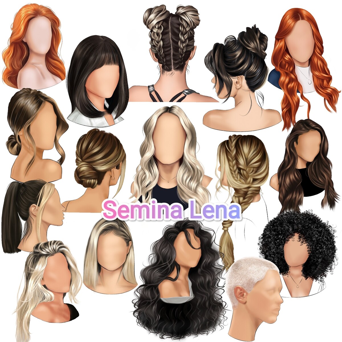 - прически (косички, пучки, хвостик, короткая стрижка, обьемные сложные прически)
